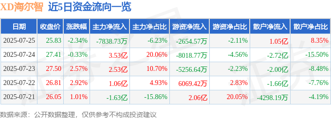 本站消息,截至2025年7月25日收盘,XD海尔智(600690)报收于25.83元,下跌2.34%,换手率0.77%,成交量48.35万手,成交额12.57亿元。